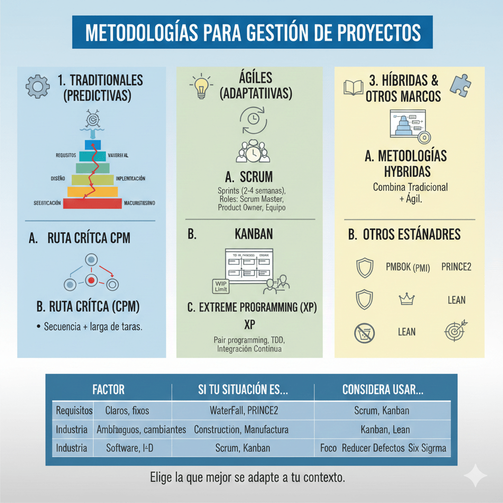 Cada una de estas metodologías tiene un enfoque particular en la mejor manera de iniciar, planificar y ejecutar proyectos. El que elija dependerá del entorno de trabajo de su organización, los objetivos y valores del proyecto y la complejidad del trabajo.