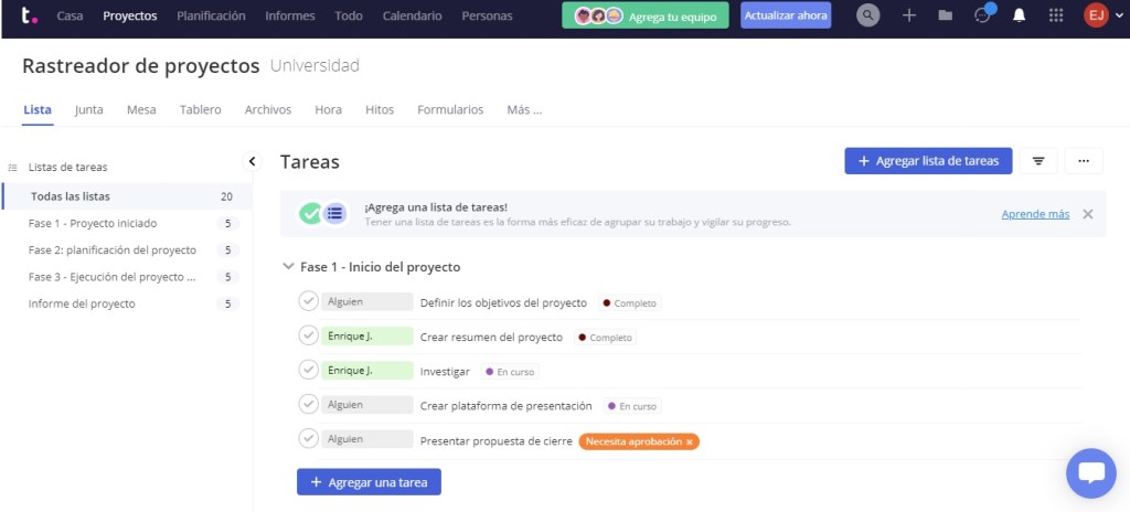 Con una herramienta de gestión de proyectos, puede ver exactamente qué debe hacerse y cuándo. Obtenga actualizaciones de estado rápidas sobre tareas e hitos, vea quién está trabajando en qué y detecte posibles bloqueadores antes de que se conviertan en problemas.